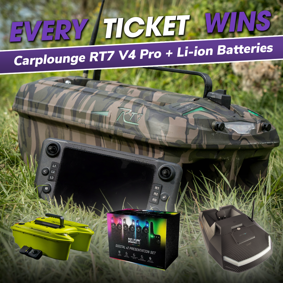 Main Prize Details: Carplounge RT7 V4 Pro Camolite Bait Boat with Lion Batteries