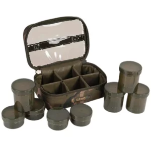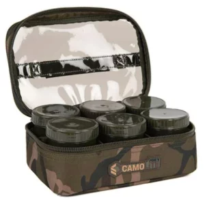 Fox Camolite Hookbait Cases, available in options supplied in either 6 Pot, 8 Pot or 12 Pots versions. All supplied with a combination of full and half sized Fox Edges Hookbait Pots. Manufactured from a hardwearing and water resistant 500D treated polyester fabric. With tinted PVC lids for easy contents identification.