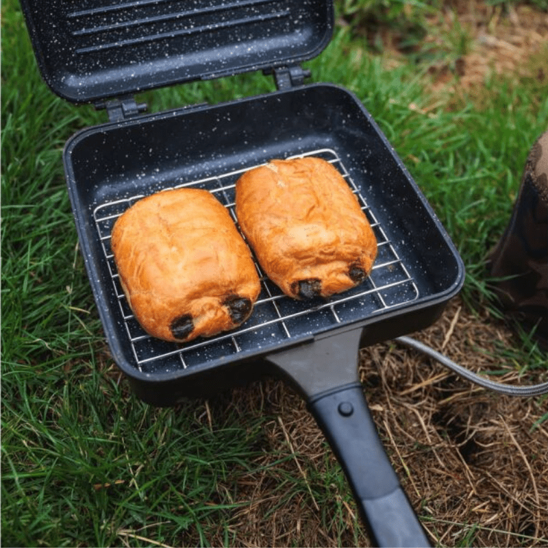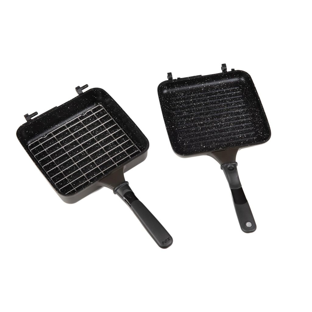 Fox Cookware Multi-Pans, die-cast aluminium pans with a high temperature nonstick marble cooking surface. Hinged and removable so each pan can be used independently. Supplied with a stainless steel wire rack to prevent pies, pastries, pizza’s etc from direct contact with the pan surface, reducing burning. Supplied in protective neoprene sleeve and for use on gas stoves only.