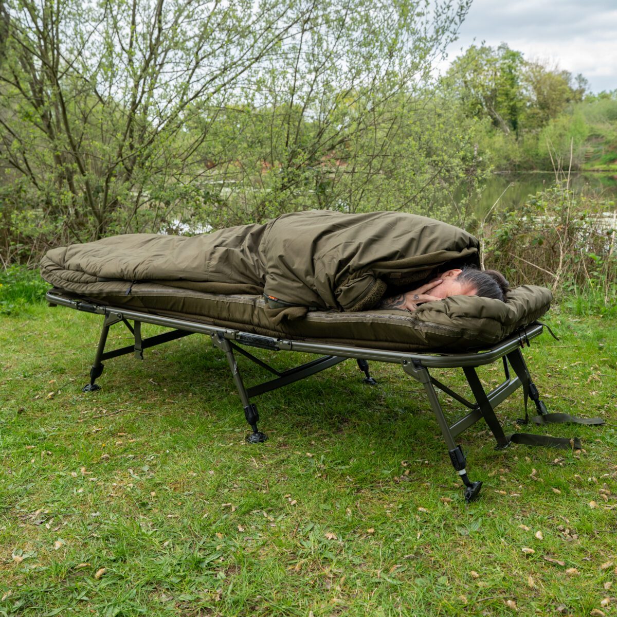 Fox Flatliner X All Season System, A complete all in one 3 and 5 season, bed and bag sleep system Featuring a Flatliner X 6-Leg bed with zipped in Ventec All Season Sleeping Bag. New and improved design that helps to make it our most comfortable bedchair ever Completely flat frame for maximum comfort. Large double hinges are designed to allow elastic to run through them ensuring consistent firmness in the whole mattress. Hinges sized to allow bed to be packed away with All Season sleeping bag still attached to create a compact, parallel, tidy pack down shape. Rubber overmoulded hinge cover prevents damage to the hinge or surface the bed is placed on.
