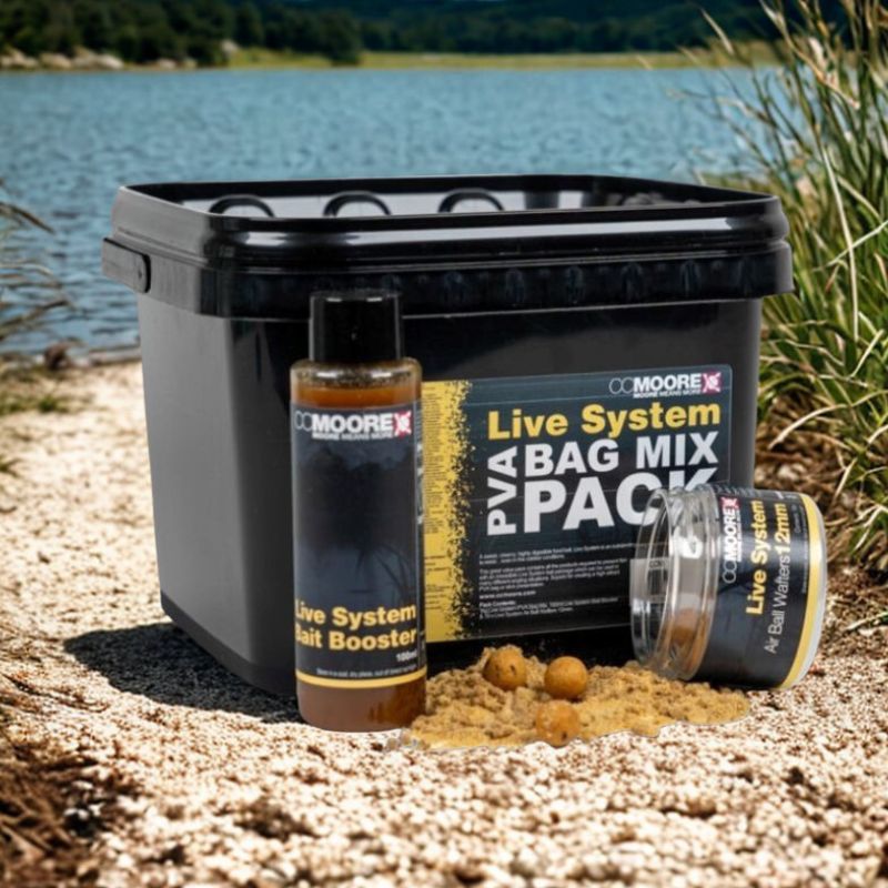 Great value Live System product pack. Contains 2kg Live System PVA Bag Mix, 100ml Live System Bait Booster & 10 x Live System Air Ball Wafters 12mm, supplied in a Black Bait Bucket or refill bag; all you need for a superb, Live System bait presentation.
