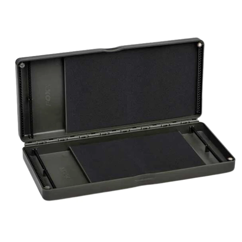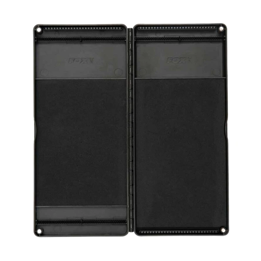 Fox Edges Rig Boxes are ideal for tying up plenty of rigs in advance of your next session. Featuring a double-ended rig board in the base and long rig board under the magnetic lid. Both with retaining pegs for securing boom sections and high density EVA foam ensuring those rig pins stay securely in place. With profiled hook bars at both ends of each board to stop rigs from sliding and bunching together. Supplied with 50 pins and available in medium and large size options.
