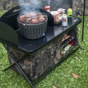 The upgraded and improved Nash Bank Life Cook Station. With an improved jointed folding frame, and now in camo. They give a wind protected cooking area and work surface, plus under table storage all of which packs away flat for transport. The main table goes up super quick, with twist lock legs ensuring you can get them perfectly level. A three way windshield then locks into place on top giving enough room for a couple of small stoves. The under table storage consists of two zip up shelves, manufactured from tough 600D fabric.