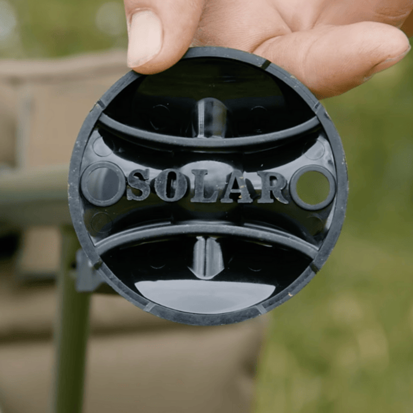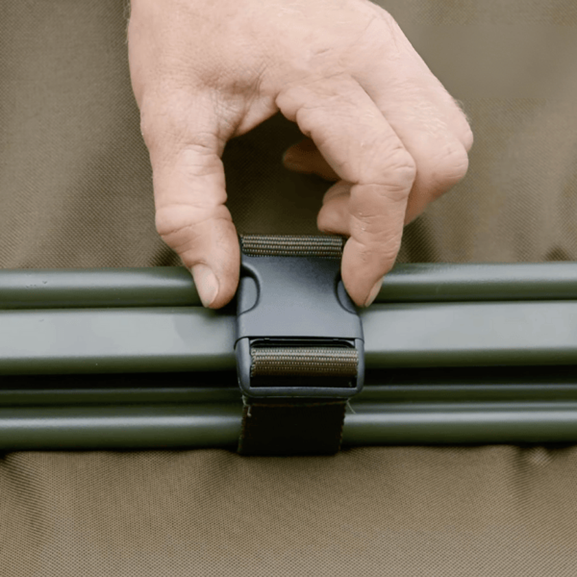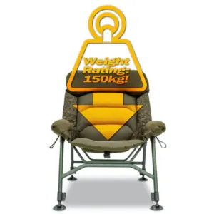 The frame is hewn from the same high tensile aluminium as Solar’s renowned bedchairs and chairs. Plus, it boasts the fixing method that makes them so famous, as it eliminates sag and takes huge weights. Both the front and rear folding legs feature securing clips so the chair won’t collapse underlateral movement and Spring-Loc leg adjustment (another Solar first) delivers effortless adjustment, with swivelling mud feet of course.